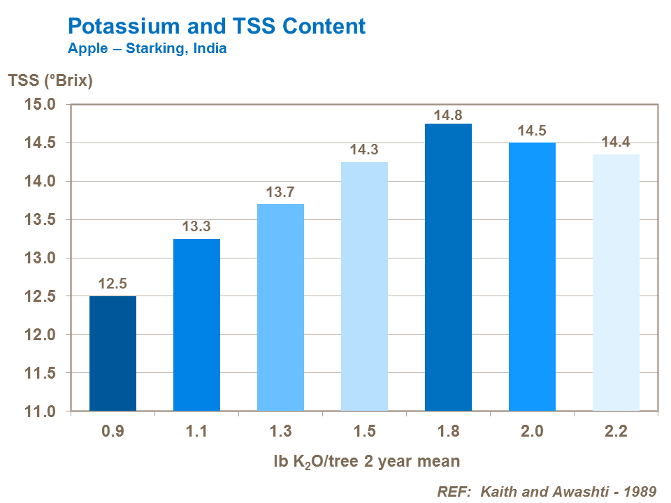 Nitrogen has a positive effect on the soluble solids content of apples. Potassium also plays an important role on sweetness, measured by oBrix, as shown in trials in India. °Brix is used to approximate the TSS content because the soluble sugars usually represent more than 75 - 85% of the soluble solids.