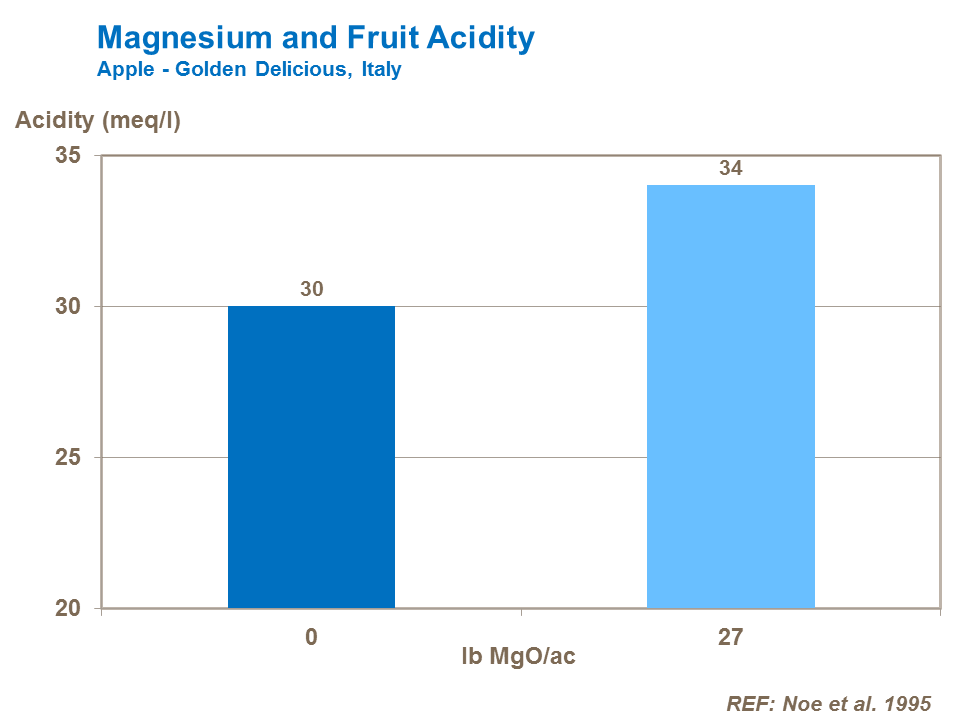 Apple acidity is a relevant characteristic for both fresh and processing markets. It is one of the main group compounds determining flavor. The higher the level of acidity, the more tart the flavor and the better the thirst-quenching properties of processed soft drinks. Magnesium has a slight effect on fruit acidity.