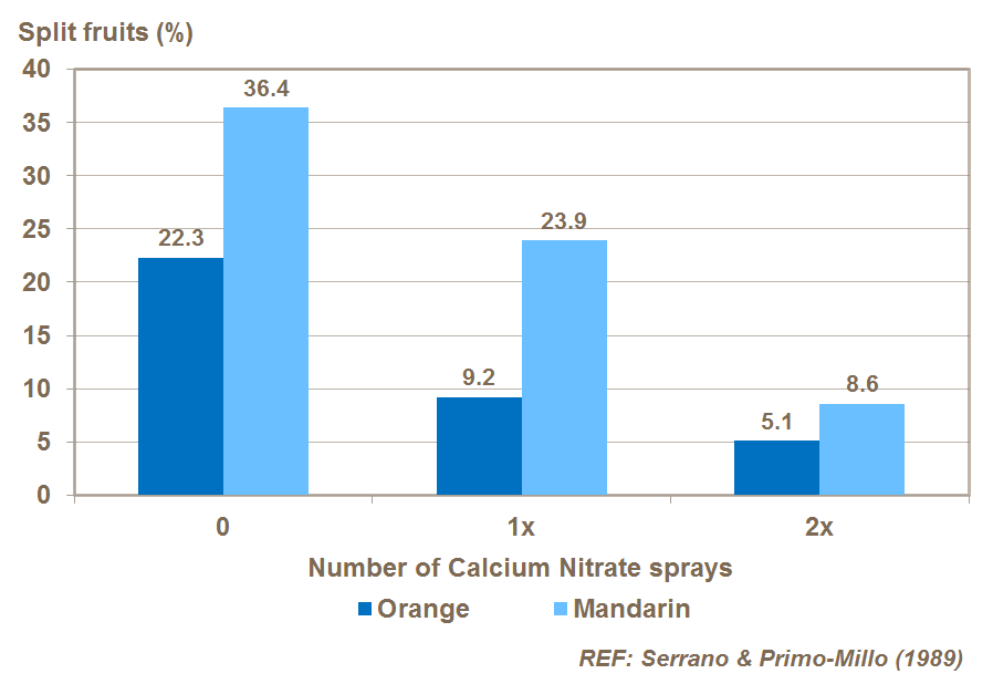 Foliar Ca sprays, reduce splitting, creasing (=albedo breakdown) and pitting diseases of oranges and mandarins. For example, Spanish works showed that two calcium nitrate sprays during the summer, reduced splitting of oranges and mandarins.