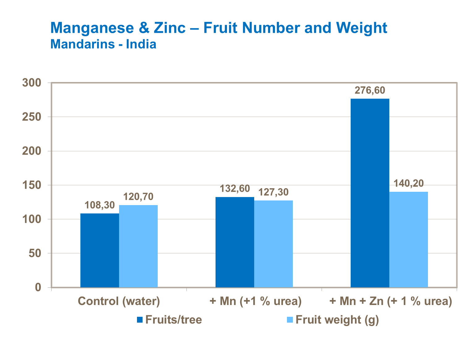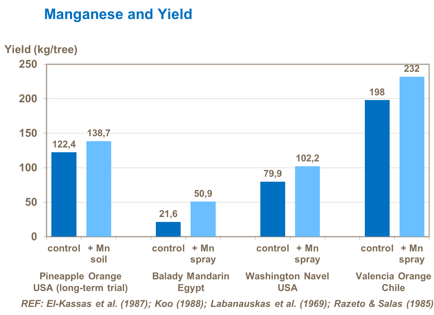 Yield increases as a result of manganese nutrition are mainly due to a higher number of fruit per tree, as can be seen on Balady oranges in Egypt.