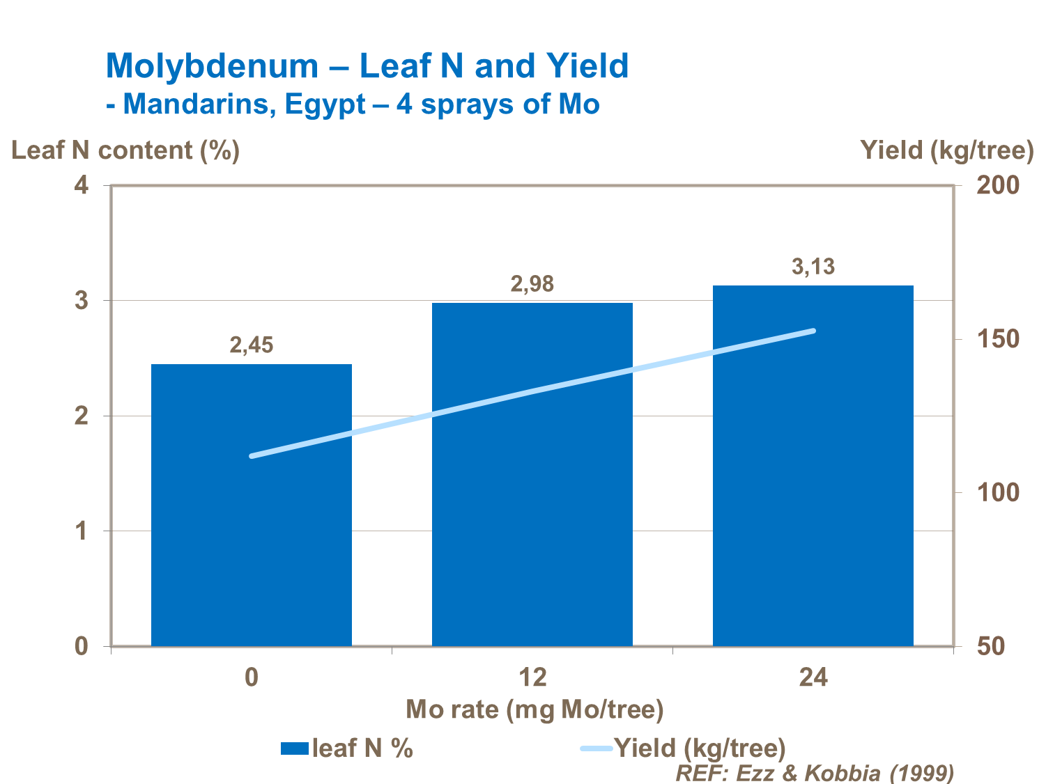 In trials carried out in Egypt, nitrate reductase activity increased with increasing rates of Mo. It was demonstrated that 6mg/tree of molybdenum improved mandarin yields by 44% and helped increase leaf-N contents.