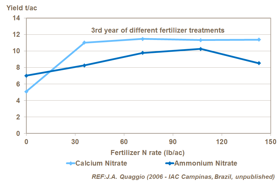 Citrus utilizes nitrogen mostly in the nitrate form although some ammonium is used, and the maximum uptake occurs from N-applications made during the periods of active growth. Also, highest yields have been recorded where nitrogen is applied as calcium nitrate rather than as ammonium nitrate (trials with Valencia Oranges in Brazil).