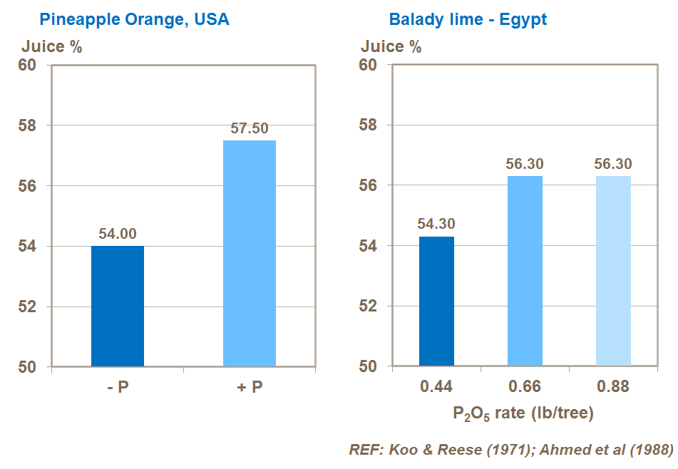 While not needed in large quantities, the correct balance of phosphorus to other nutrients is critical in citrus production. It is particularly important during early tree growth on new groves. In the long term, regular P applications will maintain the yield and fruit quality of mature citrus trees. Good availability is important during periods of active root growth e.g. springtime and in between vegetative flushes.