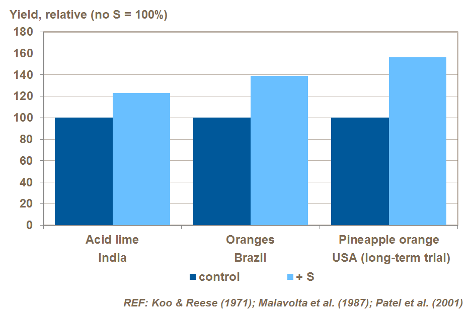 Relatively low levels of sulfur are needed in citrus production because removal is low. However, when supplies are limiting, sulfur has a direct effect on citrus yield. There is often enough sulfur in N-P or N-P-K fertilizers, micronutrient formulations or irrigation water to meet crop needs.