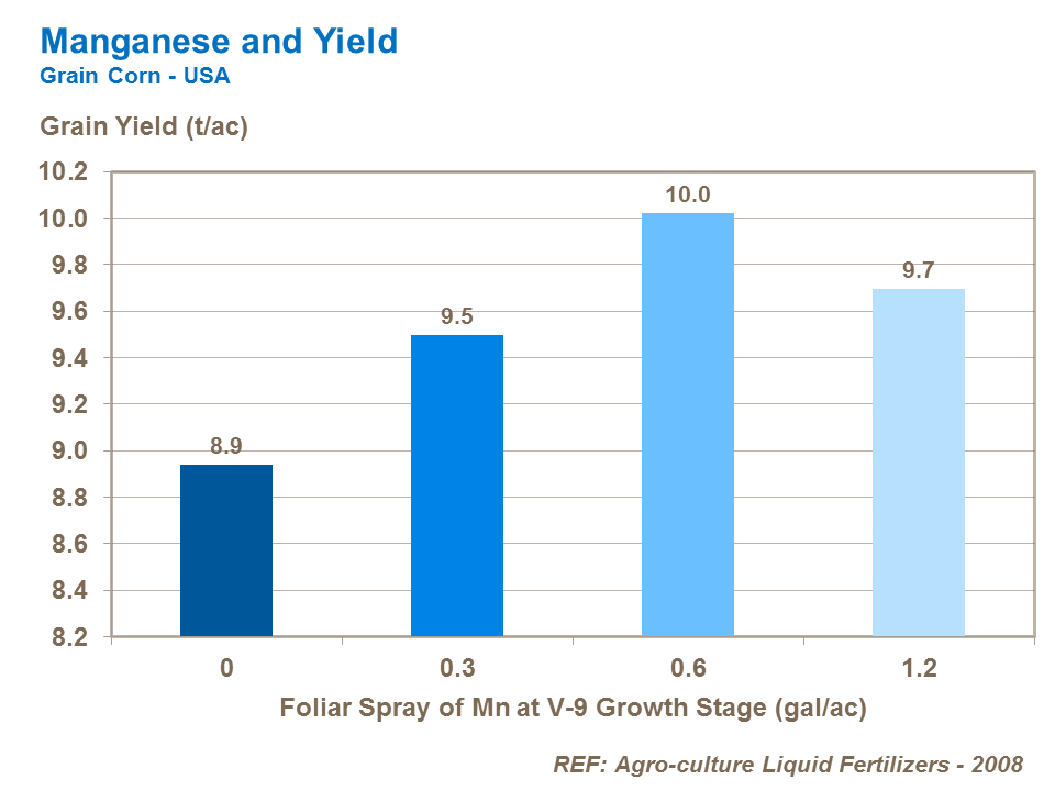 Manganese has a direct effect on plant development and growth. It is involved in chlorophyll production and photosynthesis, and acts as a catalyst in many plant growth processes including the metabolism and synthesis of proteins. Most manganese accumulates in the leaves and stems – more so than any other micronutrient. Uptake is gradual, particularly during vegetative growth. Foliar or soil applications can be used to increase grain corn yield.