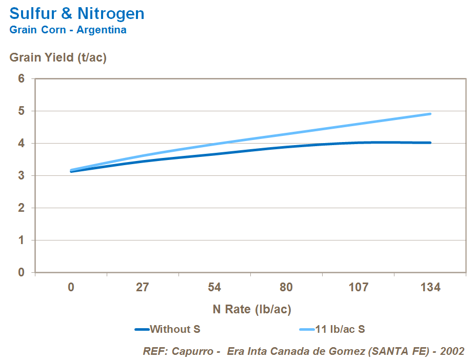 The following trials demonstrate the effects of sulfur and nitrogen on grain corn yield.