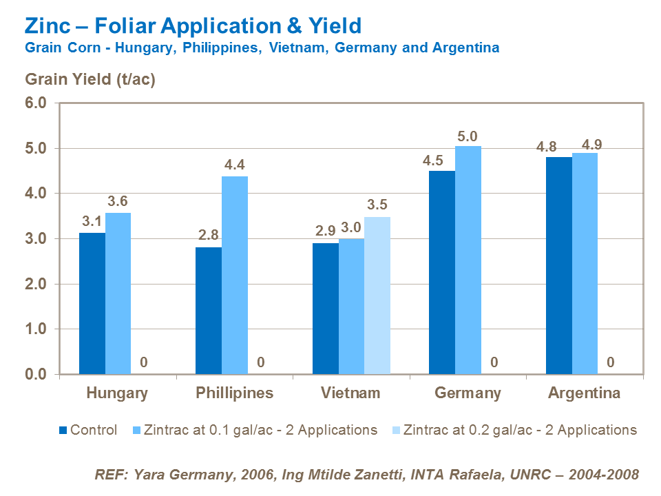 Zinc provides the largest yield responses in the greatest number of trials. The strong responses seen when zinc is applied to the seed, is largely due to zinc’s effects on early root and shoot growth and the subsequent increase of leaf production. However, high yield responses also come from foliar zinc applied to the leaf.