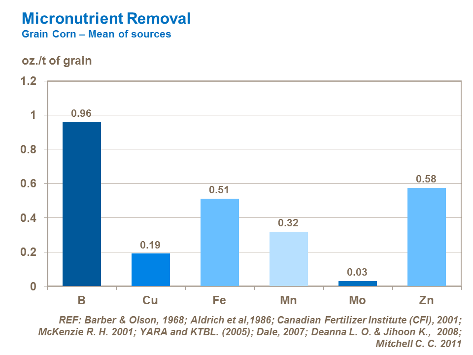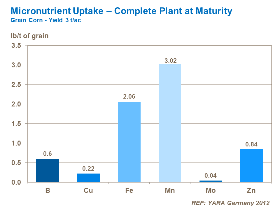 The key micronutrients taken up in greatest quantities are iron and manganese. These two micronutrients are also those which are lost in greatest quantities when the whole crop or straw is removed from the field. However, boron and zinc – which are the two most important micronutrients needed in relatively large quantities – are removed in greater quantities in the grain. It is increasingly common to apply zinc with the seed at planting to ensure good rooting and shoot development.