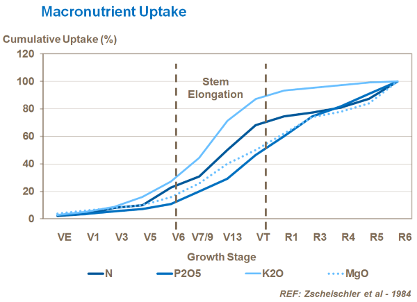 While the main period of nutrient uptake in corn is during stem extension or shooting (V6 to tasseling) unless center pivot fertigation is practiced, fertilizer needs to be applied before this because crop height and density means it is difficult to enter the field with conventional machinery after this time.