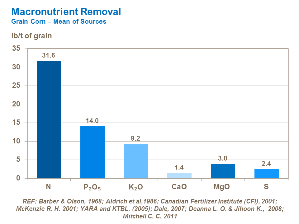 Uptake and removal figures vary according to the crop being grown. The difference in nutrient offtake between grain and silage corn needs to be considered when planning the nutrient program of the following crop. There may also be significant differences in nutrient utilization between varieties.