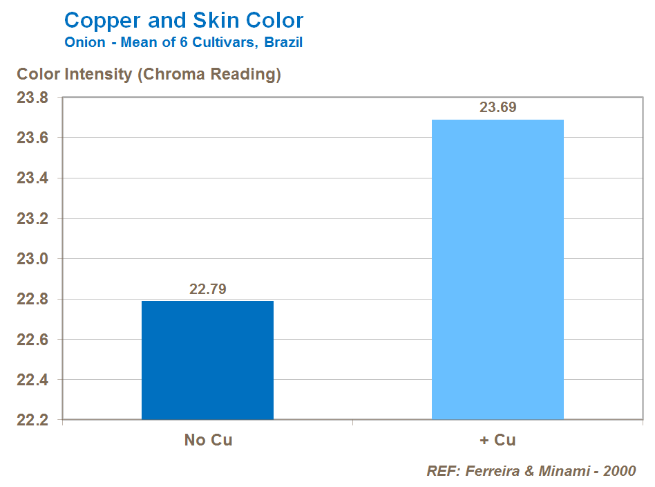 Adequate supplies of copper are important for bulb skin and onion scale development, as a result of the element’s role in lignin production. Trials show that copper can enhance skin color.