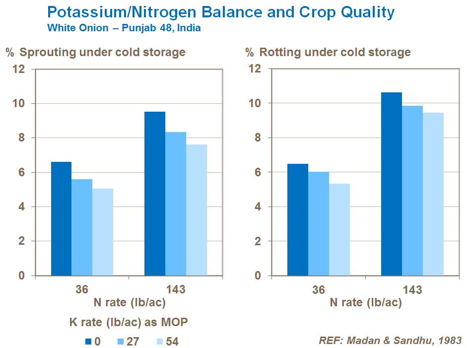 The use of potassium allows growers to maintain high rates of nitrogen for yield with reduced risk of storage problems such as rot or sprouting. Potassium also needs to be balanced with phosphorus inputs.