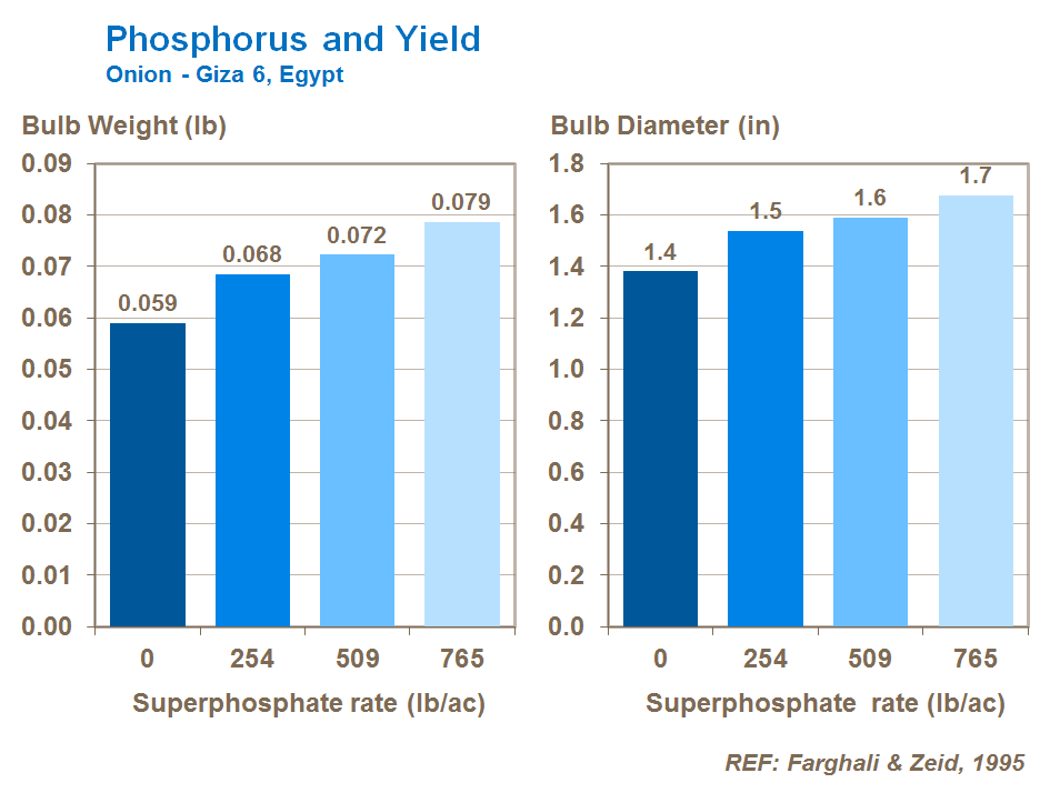 Optimum nitrogen supply is important for onion size. Nitrogen supports production of leaves and hence, increases the number of onion bulb scales and the size of the harvested bulb. Because these crops are shallow rooted with poor root branching, it is common practice to use split N applications to maximize uptake efficiency. Placement has been proven to be more effective than broadcasting.