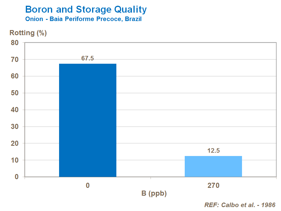 Boron helps to improve calcium uptake and bulb quality. Research shows that a boron supply can reduce onion rotting during storage. This effect is associated with the micronutrient’s role in improving calcium accumulation in the bulb.