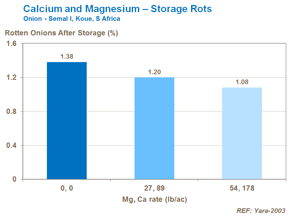 Calcium helps to improve tolerance to diseases. In association with magnesium, onion crops with high levels of calcium in the bulbs show less storage rots.