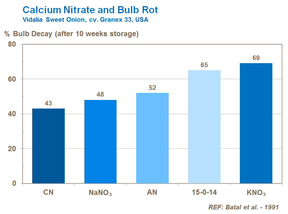 Calcium nitrate has been proven to be the most effective formulation in ensuring minimal onion rot in storage. It is important that Ca and K are in balance.