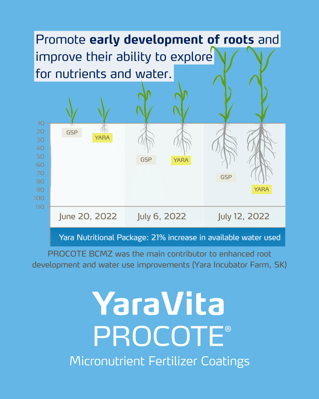Micronutrients provided by YaraVita PROCOTE aid in the early development of root systems, which improves the roots' ability to explore for nutrients and water.