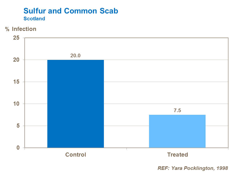 Sulfur helps to reduce the level of common and powdery scab. This effect may be due to a reduction in the soil pH where elemental sulfur is used. Best effects come from applying sulfur to the soil in a readily available form at planting. However, a program of foliar S, can also reduce infection.