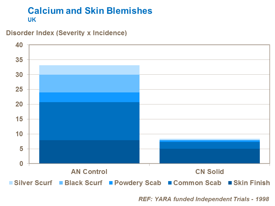 Calcium strengthens tuber skins providing better resistance to many diseases including black scurf silver scurf, powdery scab or common scab.