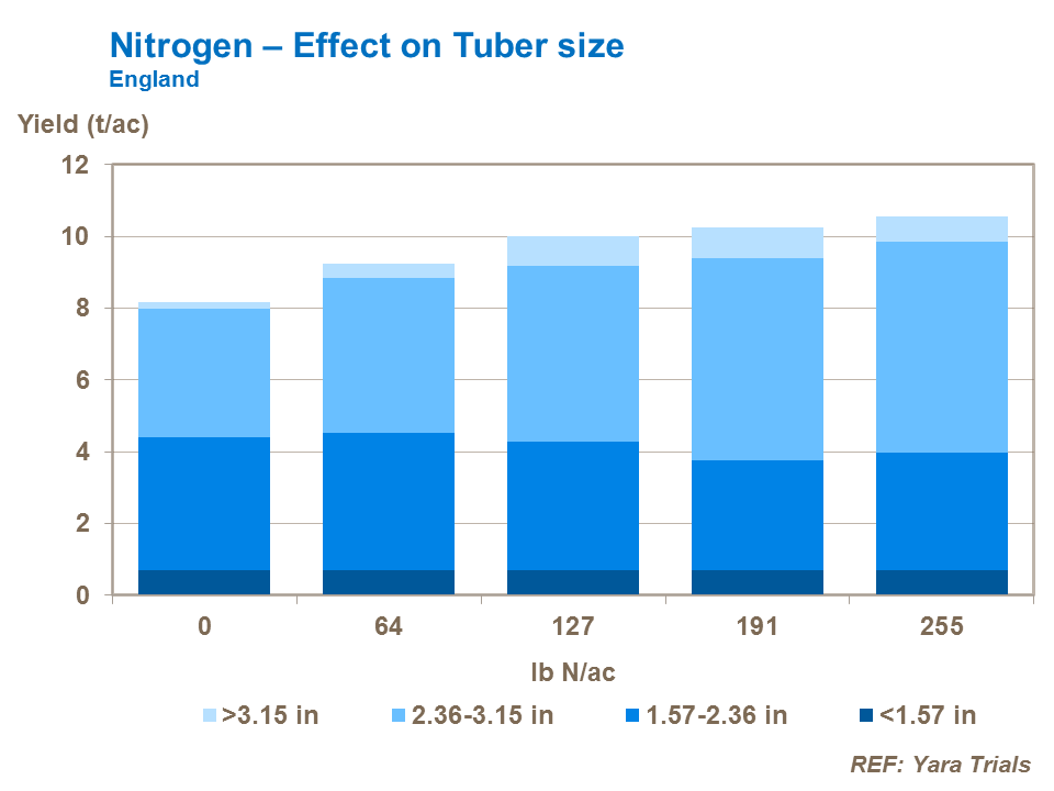 This series of trials from England demonstrates increasing rates of nitrogen resulted in an increase in tuber size and so an increase in overall yield.