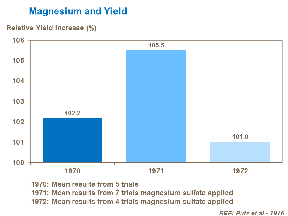 Magnesium is needed during tuber bulking and if supply is restricted tuber size and yield will both be reduced. Soils with a severe magnesium deficiency can reduce yields by up to 15%, in such cases regular applications of magnesium on an annual basis has achieved yield increases of 1 to 10% in trials.