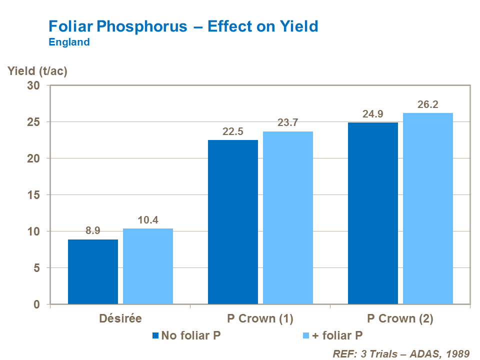 Foliar phosphate, applied after tuber initiation increases tuber size and so increases tuber yields, however, foliar phosphate is not a substitute for soil applied phosphate and without adequate soil phosphate early season growth is sub-optimal.