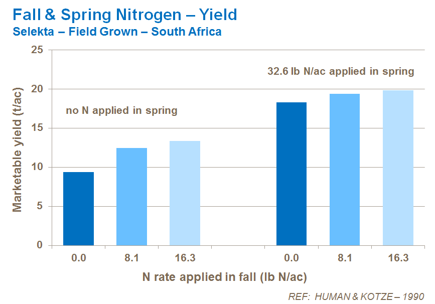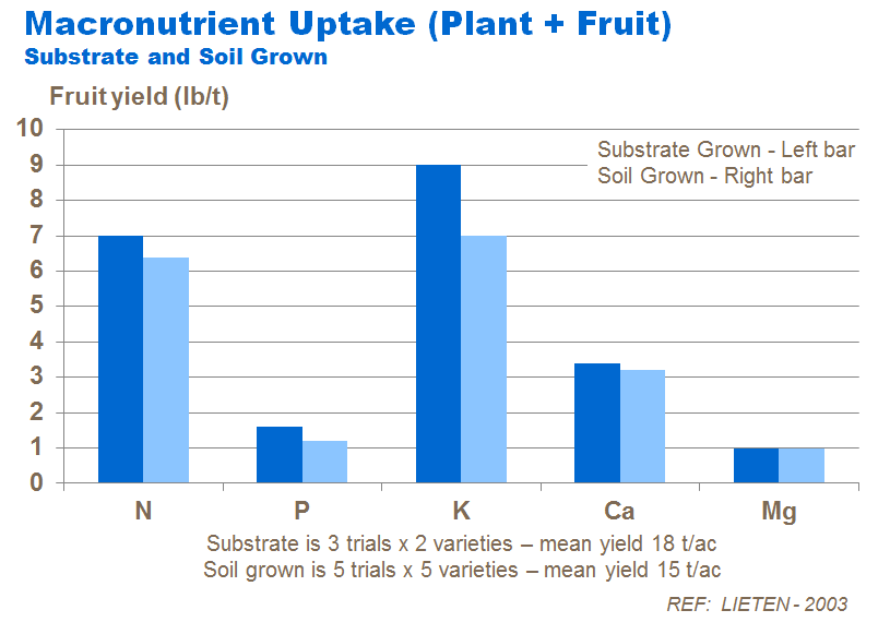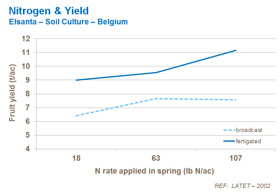 In soil cultivation systems, split application of N is recommended for what is a relatively shallow-rooted crop, commonly grown on light, leaching prone soils. Nitrogen is better utilized when applied by fertigation compared to broadcast application. A consistent low N rate applied by fertigation is much more effective than broadcasting N in one dose.