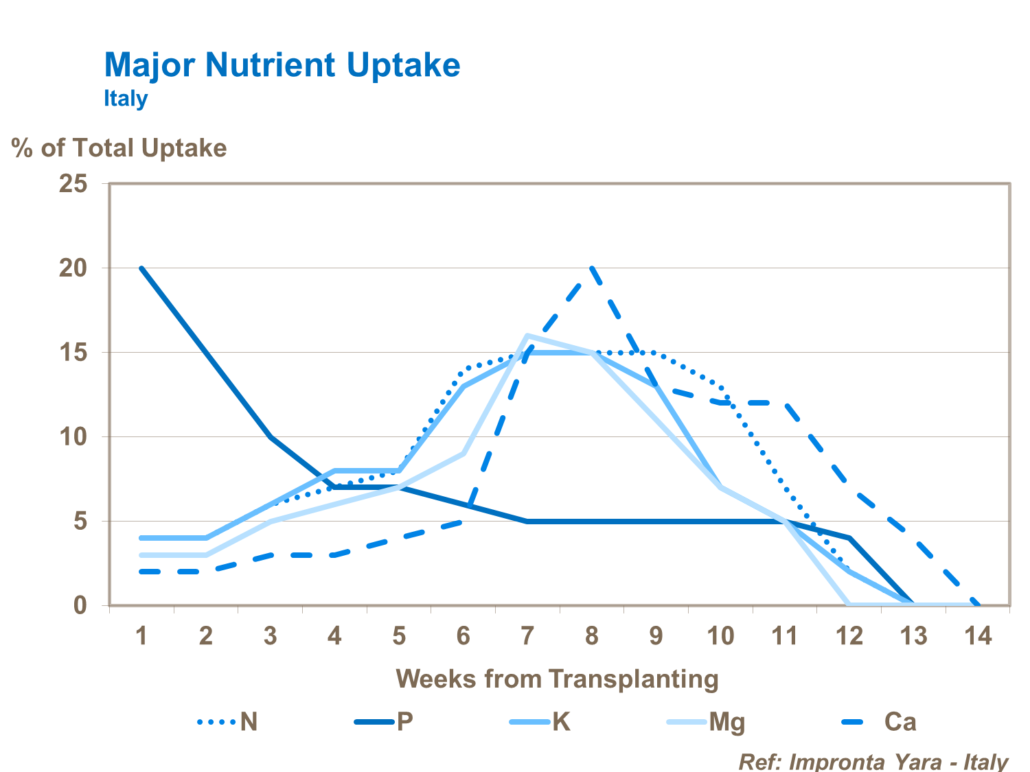 Nitrogen is needed at early stages of development to encourage good strong seedling and plant development. Peak requirement is just before flowering. Most phosphorus is required early on in the plant’s development to ensure good root growth and flowering. Potassium is needed in greater quantities than nitrogen. Calcium is also needed in relatively large quantities, mostly from flowering through fruit development and up to harvest. In many situations, it is equally as important as nitrogen. Over 60% of nitrogen, phosphorus and potassium taken up by the plant, is utilized by the fruit.