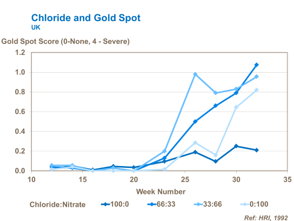 Providing a balanced nutritional program, especially between potassium and calcium will minimize the occurrence of this disorder. Use of nitrates instead of chloride-based fertilizers will reduce the risk of tomato gold spot.