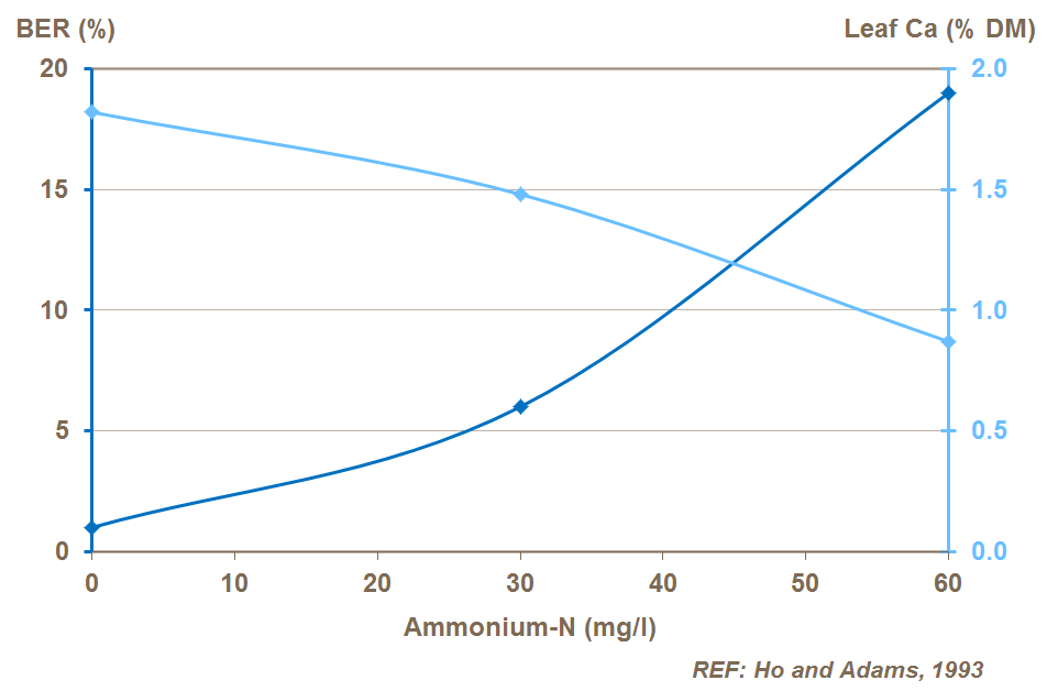 Ammonium based fertilizers are antagonistic to calcium uptake. They reduce soil pH and water uptake rate as well as slowing transpiration. When ammonium competes for uptake with calcium, it increases BER risks.