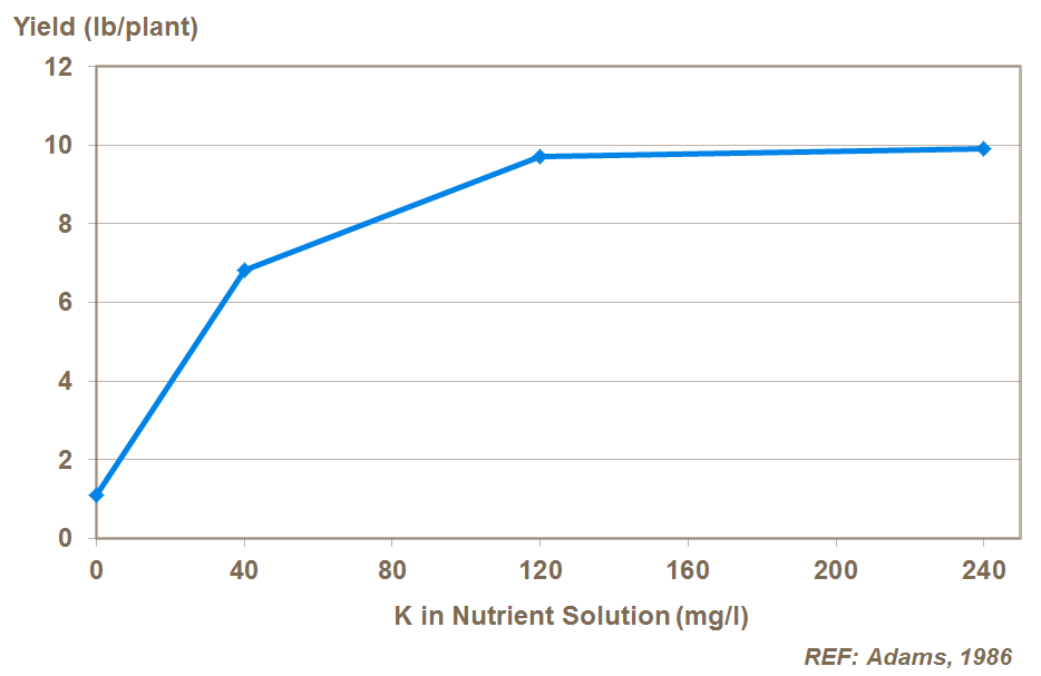 Tomatoes have a relatively high potassium requirement compared to nitrogen with over 267 lb/ac of potassium typically being utilized. Potassium is needed throughout the season and is a major component of the fruit at around 250mg K per 100g of fruit. It is essencial to maintain a good balance of potassium with magnesium and calcium. Too much potassium restricts the uptake of these other cations. Use of high levels of potassium in tomatoes is particularly important under saline conditions to maintain plant growth. Excess sodium reduces the uptake and transfer of potassium through the plant and thus potassium levels need to be increased in order to maintain plant growth.