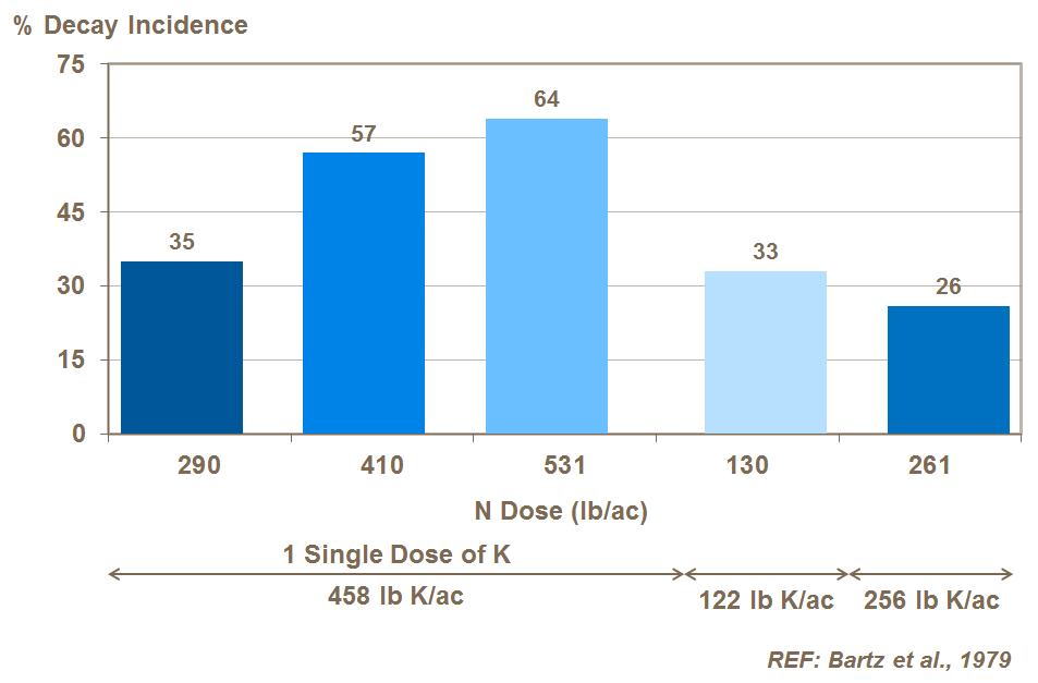 Maintaining high levels of potassium can help alleviate problems of rots caused by high nitrogen levels, as studies in US show.