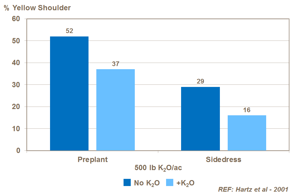 Studies in US also show higher incidence of yellow shoulder as a result of lower than adequate levels of potassium.