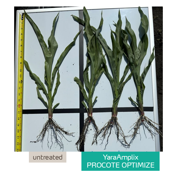 60 days after seeding, plants treated with PROCOTE OPTIMIZE showed improved development with larger, deeper root structure and improved stalk thickness.