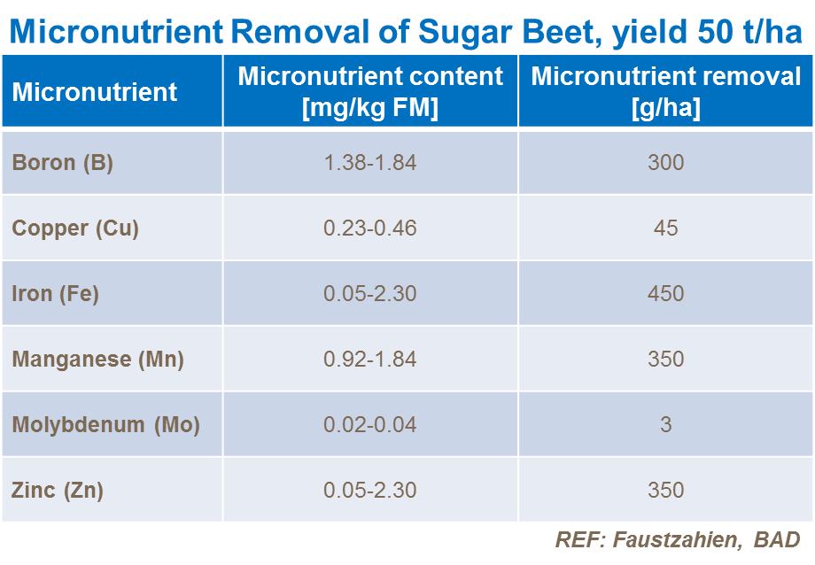 Sugar beets are known to require large amounts of micronutrients. Especially boron, manganese, copper and zinc. The table gives average figures of removal of micronutrients in a sugar beet crop.